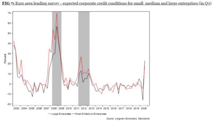 這不是美國獨有的現象。歐洲央行開展了類似的調查,也得出了相同的結論:信貸正急劇緊縮,尤其是對於中小企業而言,情況十分危急。