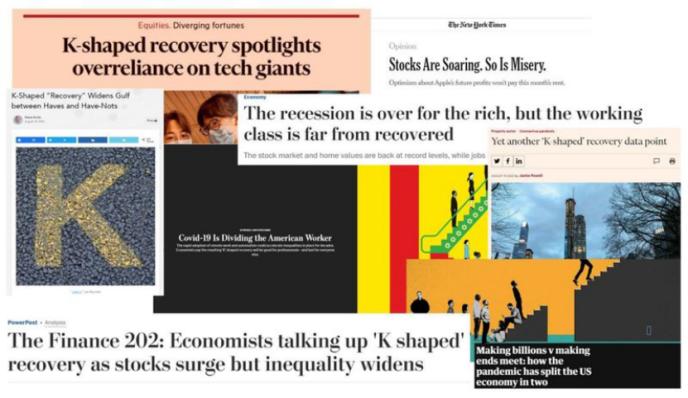 這個詞語來源於Financial Insyghts諮詢公司總裁阿特沃特(Peter Atwater),意思是市場反彈是不均衡的:在新冠疫情引發的崩盤之後,一些市場再次反彈,而另一些市場出現下跌,由此形成了一個“K”型。