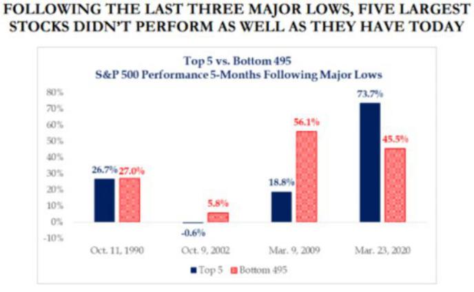 如此有利於這五大公司的不平衡復甦是比較罕見的。下圖對比了目前標普500指數中市值排名前五的股票自3月低點以來的漲幅,並統計了這些股票在經歷了歷史上三次大崩盤後的複蘇表現。從中我們可以發現,標普500指數中市值最大的5家公司表現遠超其餘495家公司。