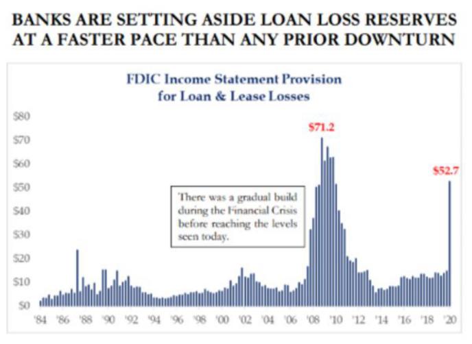 另一個導致股市反彈出現分化的重要因素是債務問題。隨著賬單即將密集到期,未來幾個月壞賬規模可能會激增。如下圖所示,與上次信貸危機相比,美國的銀行正以更快的速度增加貸款損失準備金。