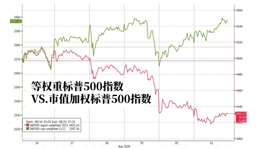 上週一整週,標普500指數(按市值加權)上漲了72個基點,創下歷史新高,而等權重的標普500指數卻是下跌了1.5%,且仍較其2月紀錄高點低8%。”