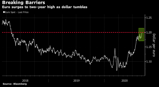 在美元全線走低的推動下,歐元逾兩年來首次升破1.20美元。