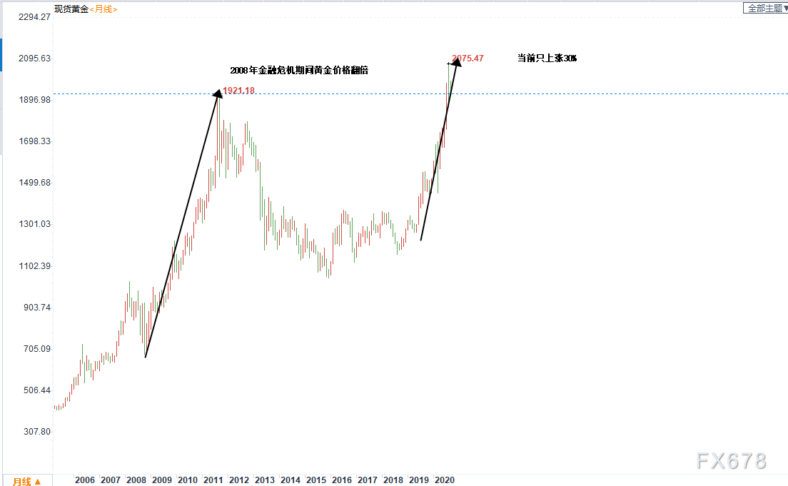 首先黃金價格在金融危機期間上漲了一倍多,而自疫情大流行以來上漲了不到30%。