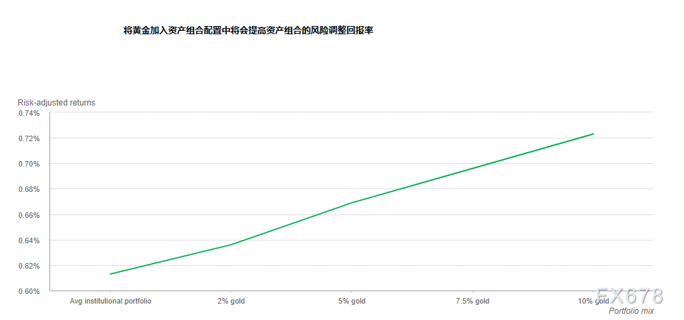 它顯示,如果將投資組合的2%、5%、7.5%或10%配置在黃金上,機構投資者平均能獲得更高的風險調整後回報。自全球金融危機以來,這種積極影響尤其明顯。