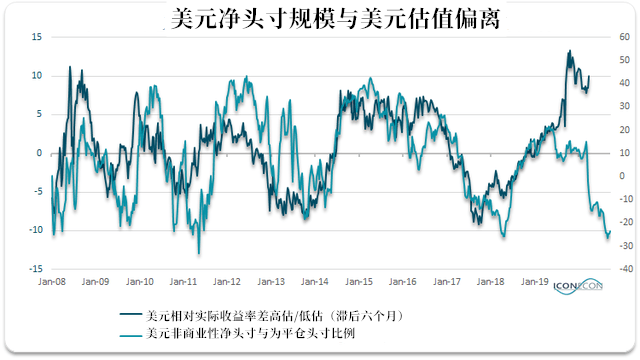 如上圖所示,美元非商業淨頭寸佔未平倉頭寸比例的波動,往往會傳導至美元指數與其公允價值之比在約6個月內的波動。然而,在過去6個月裡,儘管看跌的投機性頭寸有所增加,但美元相對於實際收益率利差的表現卻明顯好於其他貨幣。