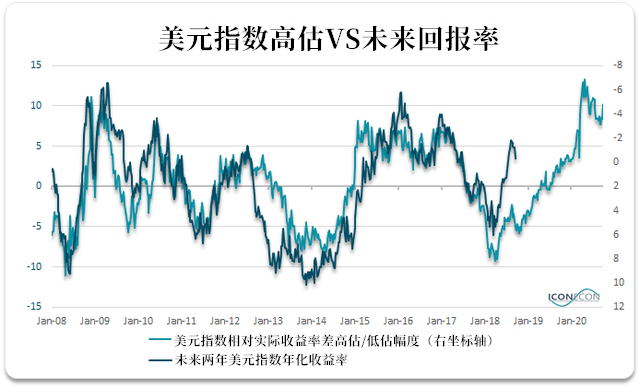 美元指數與實際收益率利差所暗示的公允價值之間的差異,為美元指數在隨後兩年的表現提供了良好的指標。目前的實際收益率利差顯示,未來兩年美元指數將面臨4%到5%的降幅。