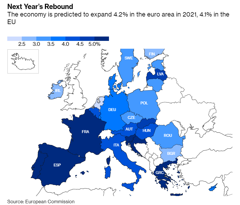 歐盟委員會周四表示,2021年歐元區經濟將增長4.2%,增速低於此前預期。歐盟認為今年的萎縮幅度將會小於此前預期,不過這還不包括政府最近的封鎖。政府封鎖可能會將歐洲一些最大的經濟體重新推入衰退。