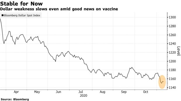彭博美元即期匯率指數已經從周一的最低水平回升。當時,新冠疫苗取得積極進展的消息讓這個美元指數跌至2018年4月以來最低水平。幾個月來,人們都認為疫苗助長的全球經濟反彈將為投資者在美國以外尋求更好的機會鋪平道路,從而會打擊美元匯率。而且,民主黨人拜登贏得總統大選被視為邁向大規模財政刺激的一塊墊腳石。