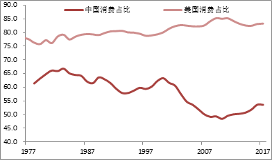 如果用支出法來衡量最終消費(以下簡稱消費)對GDP的貢獻,過去兩年有所上升,達到53.6%,但美國消費對GDP的貢獻長期以來都在80%以上,全球大部分國家的消費佔GDP比重都在60%以上。道理很簡單:全球資本形成(以下簡稱投資)對GDP的貢獻大約在22%左右,餘下的就是消費和出口了。