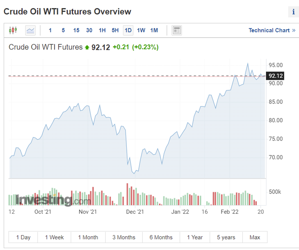 俄羅斯總統普京下令俄羅斯軍隊進入烏東地區之後,原油價格劍指100美元/桶。