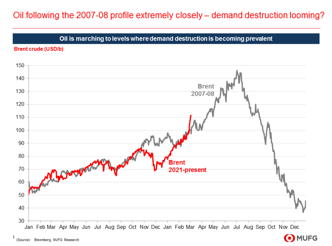 三菱UFJ金融集團(MUFG)分析顯示,布倫特原油價格飆升的軌跡與2007-08年如出一轍,當時油價曾觸及每桶150美元的創紀錄高點,隨後需求銳減,價格在全球經濟衰退中暴跌。