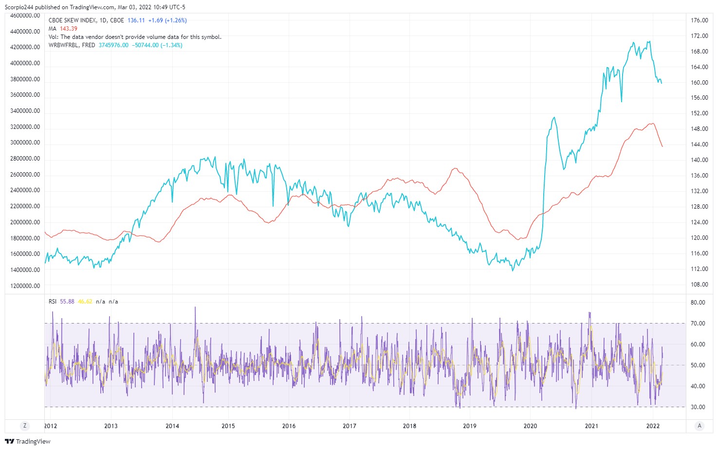 準備金圖表以及SKEW指數150日移動均線顯示一個有趣的關係,表明隨著美聯儲停止量化寬鬆政策,對沖空頭波動率的需求正在減弱,因為出於對更高波動率的擔憂,交易員不再從事這類空頭波動率交易。