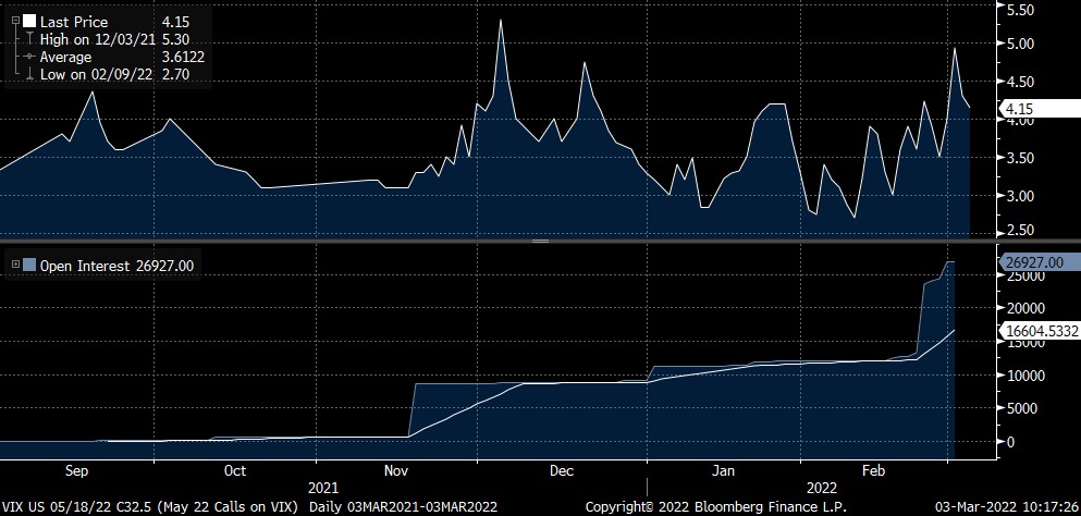 3月2日活躍的期權相當多,對VIX指數來說非常樂觀。 例如,3月3日,5月18日32.5看漲期權的未平倉合約增加了約15,100份,未平倉合約數量的變化反映了前一個交易日的期權活動。 數據顯示,這些看漲期權在ASK上交易,每份合約的買入價格為4.30美元。 這意味著到5月中旬,VIX指數將徘徊在36.8點位上方的交易區間。 這是一場規模可觀的賭注,支付的保費金額超過600萬美元。