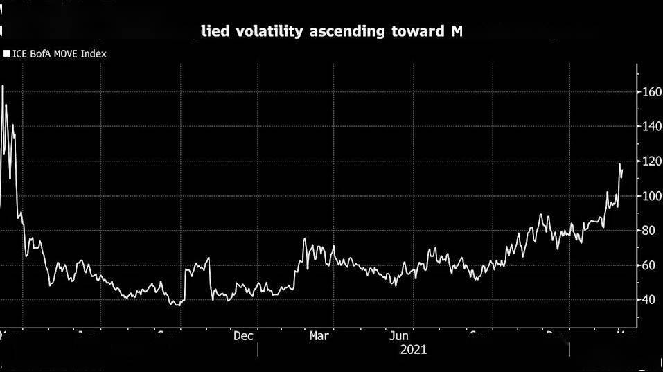 目前,市場已經預計美債收益率將出現進一步動蕩。 一項衡量美國國債隱含波動率的指標——美銀MOVE指數目前正處於2020年3月疫情動蕩時期以來的最高水準。
