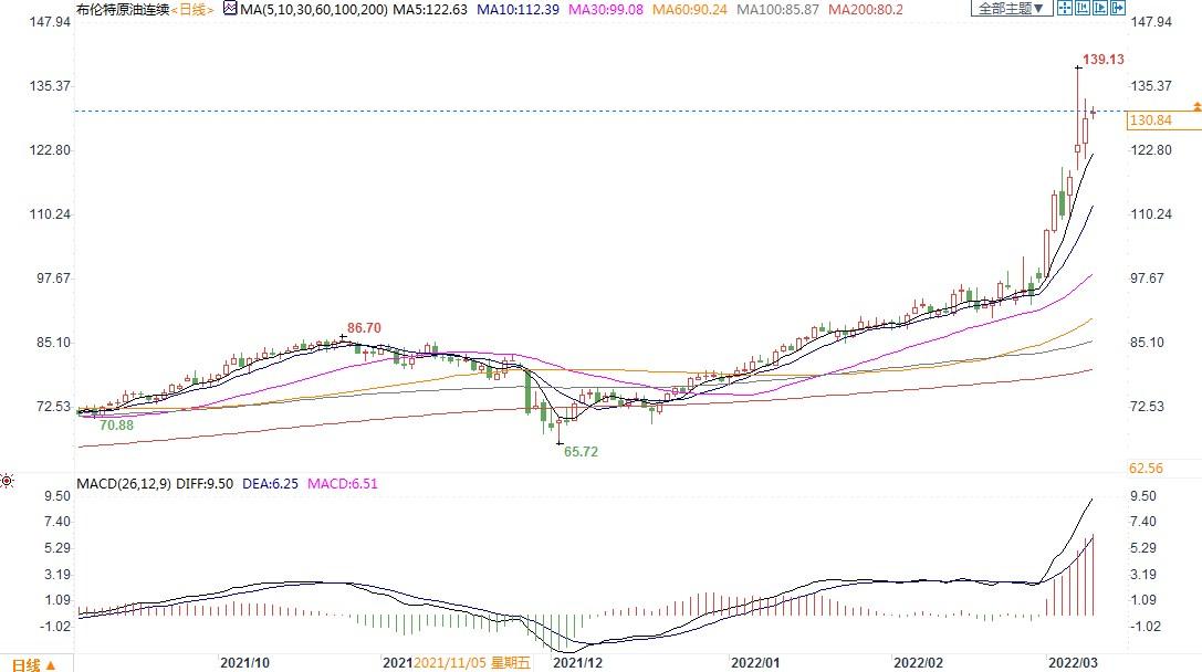 布倫特原油日線圖日期:3月9日13:17 布倫特原油連續每桶130.84美元