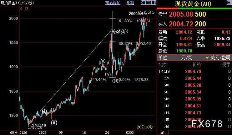 日線上看,金價自1779美元開啟上行5浪走勢。 小時圖上看,金價可能自1878美元開啟上行((iii))浪走勢,上破61.8%目標位1998美元,上方阻力看向76.4%目標位2027美元。 ((iii))浪是5浪的子浪。
