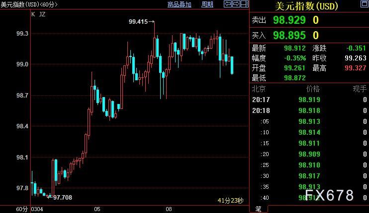 北京時間20:18,現貨黃金上漲0.54%至2008.10美元/盎司;COMEX期金主力合約上漲0.92%至2014.2美元/盎司;美元指數下跌0.35%至98.907。
