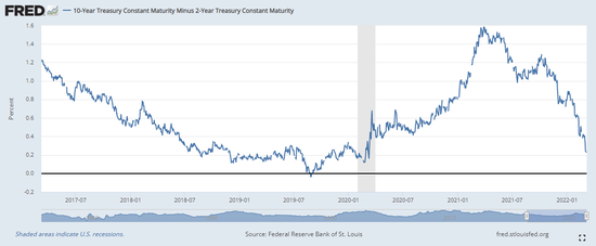 早在俄烏衝突升級之前,疫情之後的經濟反彈就已開始放緩,價格上漲正在加速,美聯儲正準備開啟加息週期。 美債收益率曲線逐漸趨平,這表明明年出現經濟週期的中期放緩或末期衰退的可能性增加。