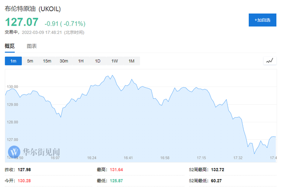 截至發稿,布倫特原油跌0.71%,報127.07美元/桶。