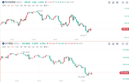 周一開盤后,美、布兩油震蕩下跌。 歐盤前跌幅進一步擴大,WTI原油日內大跌5%,下破104美元/桶;布倫特原油跌超3%,一度跌破108美元/桶。