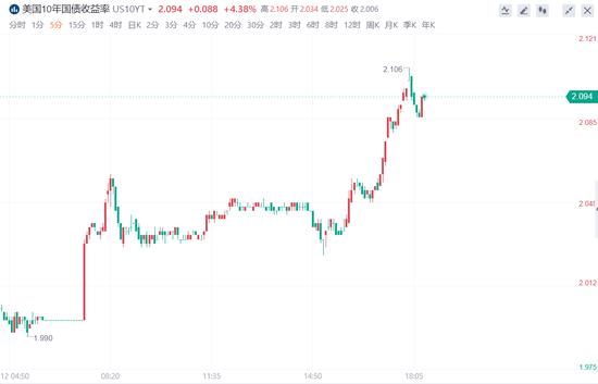 美元兌日元向上觸及118,為2017年1月以來首次,日內漲0.62%。 美國10年期國債收益率站上2.1%,續刷2019年以來新高,較日低上漲近8個基點。