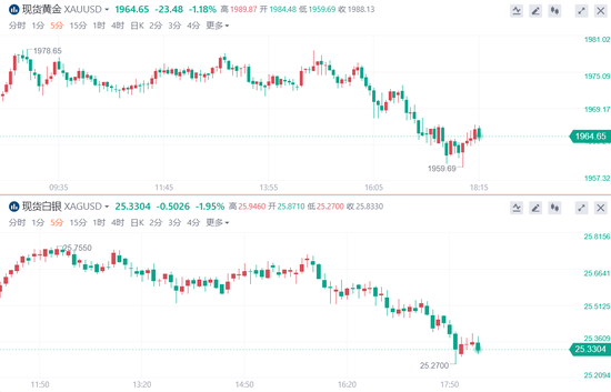 現貨黃金開盤振幅達9美元,盤中跌破1970美元關口,並一度下探1960美元關口;現貨白銀日內跌超2%,至25.3美元/盎司附近;現貨鈀金日內暴跌10%,報2525.96美元/盎司。