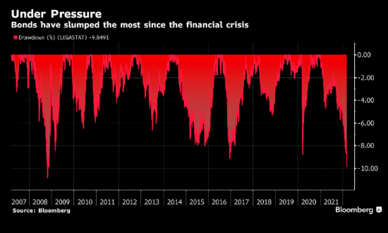 數據顯示,作為政府與公司債券基準的彭博全球綜合指數已較2021年初的高點下跌約9.9%,是2008年以來該指數較峰值水平出現的最大幅度回撤。