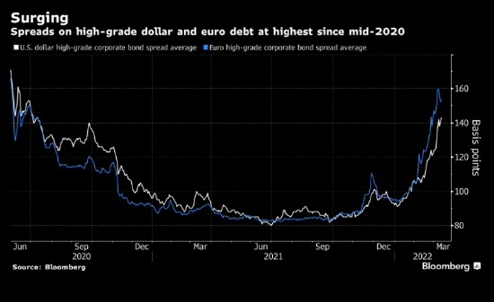 在經歷了數周的資金流出后,整體信用市場也一直顯現惡化的裂痕。 彭博指數顯示,投資級美元公司債與歐元計價公司債的利差今年以來已飆升逾55%,觸及2020年年中以來的最闊水準。