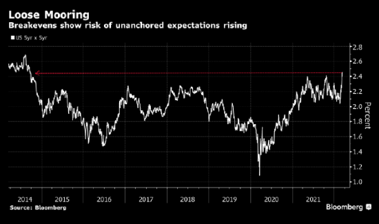 這是市場對未來10年的價格預期指標急劇上升傳遞出來的資訊。 該指標意在剔除短期波動。 5年/5年遠期盈虧平衡通脹率週二升至2014年以來最高水準,而就在幾天前,10年期指標創下了彭博1998年開始跟蹤相關數據以來的最高紀錄。