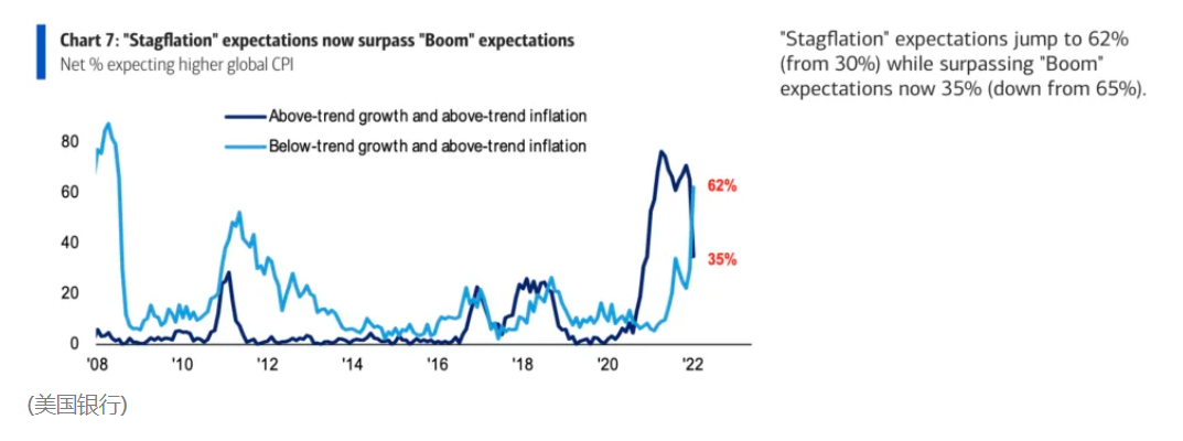 事實上,不僅是美國,對全球經濟增長的預期也跌至最低水準。 60%的受訪者認為當前市場處於「週期後期」 ,這在經濟衰退時期很常見。 受訪者還認為俄烏衝突是最大的「尾部風險」 ,44%的受訪者將持續衝突列為造成巨大影響的最大威脅。