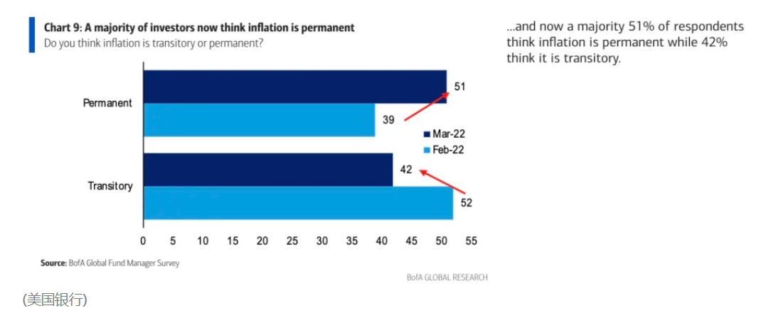 在通脹方面,51%的受訪者認為通脹將是永久性的,而42%的人認為通脹將是暫時的。