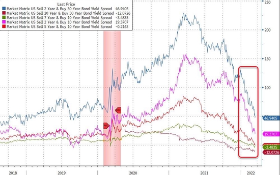 本週五,沃勒等人講話當天,3年和5年期美國國債收益率曲線自2020年3月以來首次出現倒掛,3年和10年期、5年和10年期、7年和10年期以及20年和30年期收益率曲線也都處於倒掛。 收益率曲線倒掛被一些分析人士視為經濟衰退將至或者經濟增長將惡化的危險信號。