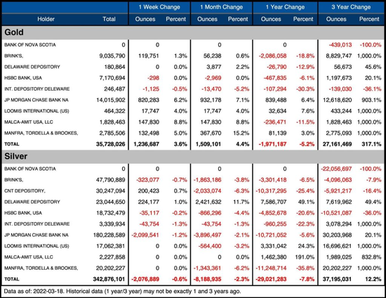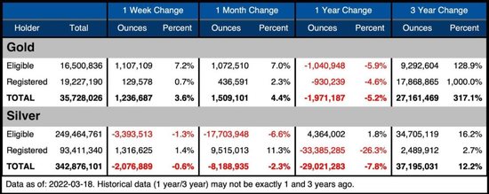 希夫指出,在過去的幾個月里,紐約商品期貨交易所(Comex)的黃金庫存一直在穩步下降,但從3月1日以來增加了160萬盎司。 雖然3月只過了大半個月,但這一數位是自2020年10月以來的最大單月庫存增加量。