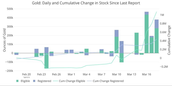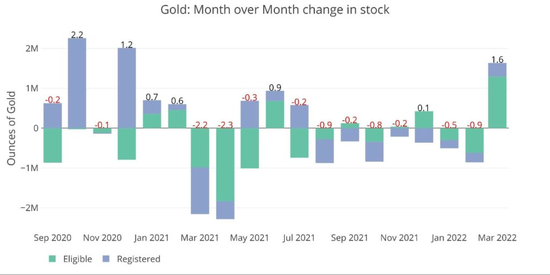 Comex的黃金庫存3月以來大幅增加了160萬盎司,這可能暗示著,機構正在為更高的黃金交割量和更高的金價做準備。