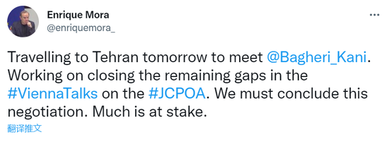 希揚提到,歐盟對外行動署副秘書長莫拉將於當晚抵達德黑蘭,雙方將就目前的局勢發展做進一步交流。 此外,他提到,維也納會談的任何成果都不會超過原有伊核協定範疇和框架,伊朗已經"在解除(美國)制裁方面取得長足進步。 ”