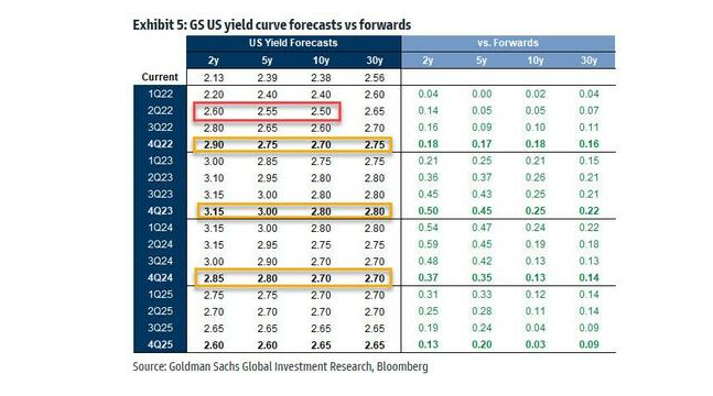 高盛對短債的預測調整更大。 該行分析師現在預計2年期美債收益率2022年底將達到2.9%,2023年底將達到3.15%。 週四2年期美債收益率最新報約2.147%。