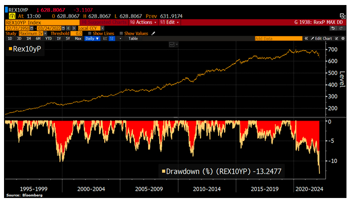此外,德國的債券基準指數也遭遇了歷史上最大的回撤——自峰值水準下挫了13.3%。
