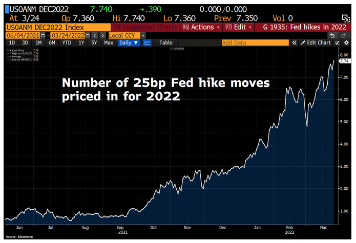 以美聯儲主席鮑威爾為首的聯儲官員們已暗示,該聯儲接下來可能會選擇更大幅度的加息力度。 利率掉期市場的數據顯示,交易員們預計美聯儲到今年年底將進行7.74次25個基點的加息,這預示著年內在年內剩下的六次會議上,該聯儲不僅均會加息,而且某次會議上的加息幅度很可能達到50個基點。