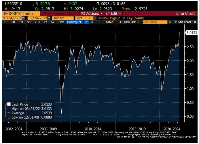 目前,衡量通脹預期的指標10年期TIPS盈虧平衡通脹率在週四已首次升破了3%,顯示市場預計未來10年美國平均年通脹率將超過這一關口。