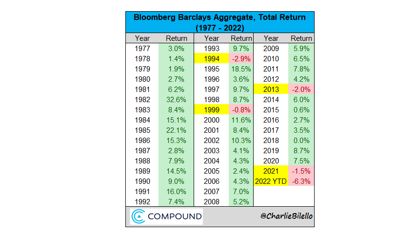 在美國市場上,今年迄今為止,彭博巴克萊美國債券綜合指數也下跌了6.3%,如果全年最終以這樣的成績單收官,將是歷史上最糟糕的一年,此前的歷史最糟糕紀錄為1994年的-2.9%。