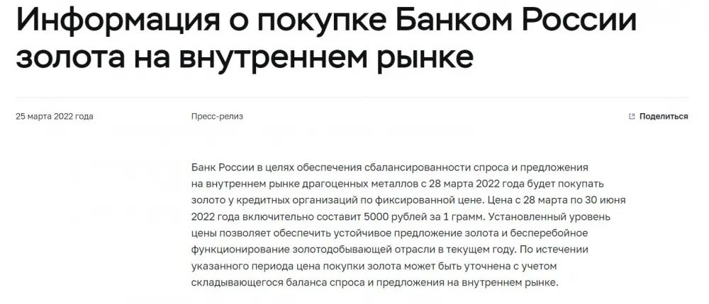 當地時間3月25日,俄羅斯央行宣佈,將從2022年3月28日起以固定價格從信貸機構購買黃金,2022年3月28日至6月30日期間的購買價格為每克5000盧布(以當前匯率折算約合52美元)。