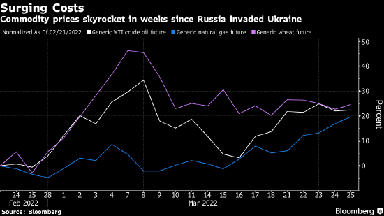 能源和食品成本上漲,對前沿經濟體和進口這些大宗商品的國家造成了嚴重衝擊。 自從俄烏局勢升級以來,石油期貨價格上漲了22%,天然氣期貨上漲了20%,小麥期貨上漲了24%。