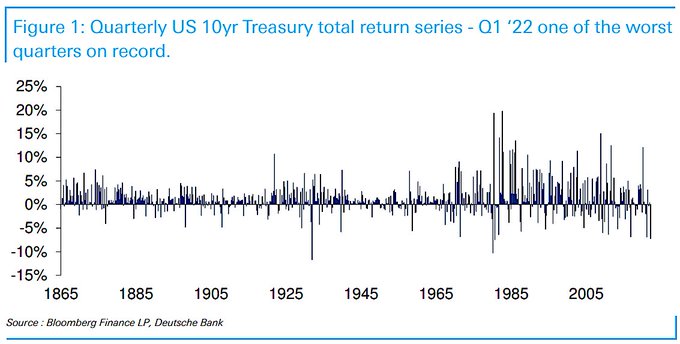 財聯社(上海,編輯瀟湘)訊,隨著市場今日步入3月的最後一個交易日,一季度的行情即將正式落下帷幕。在這短短90多天的時間裡,全球債市遭遇的“血洗”幾乎令所有華爾街交易員都印象深刻,而其中,有著“全球資產定價之錨”之稱的10年期美債,無疑也難逃此劫——一項統計顯示,10年期美債料將錄得過去157年來總回報最差的季度表現之一。