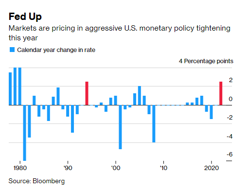 交易員認為,在3月已經實施的25個基點的基礎上,今年年底前還會再上調利率225個基點。在一年之內加息250個基點,自1994年以來美聯儲還沒有執行過這種程度的緊縮政策。
