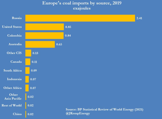 具體來看,歐洲一般會從俄羅斯購買兩種煤炭,一種是發電廠使用的熱煤,另一種是用於煉鋼的冶金煤。俄羅斯佔歐盟動力煤進口份額的70%,德國和波蘭尤其依賴俄羅斯。