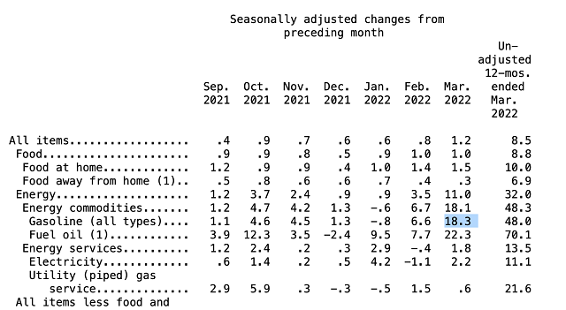 數據顯示,汽油、居住成本和食品價格上漲是推動3月美國整體物價繼續上漲的主要因素,3月汽油指數上漲18.3%,佔所有項目月漲幅的一半以上,剔除食品和能源的核心消費者物價指數年率為6.5%。