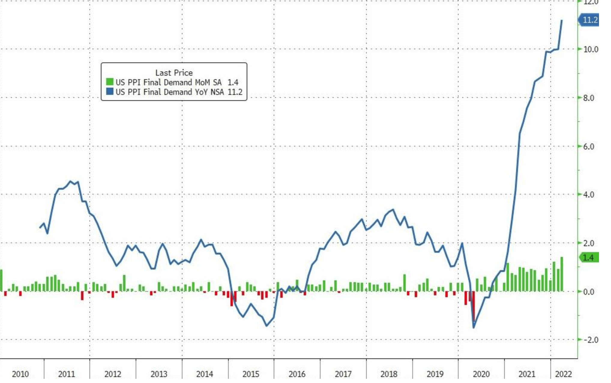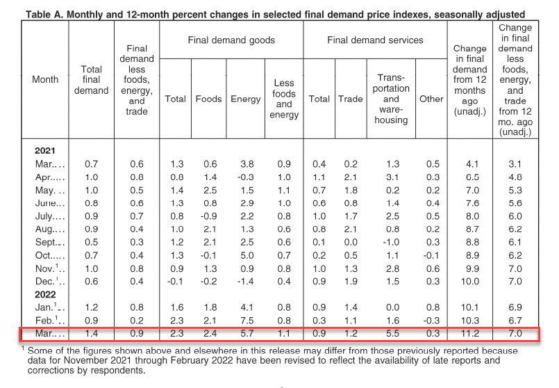 4月13日週三,美國勞工部發布的數據顯示,美國3月PPI同比增長11.2%,為該機構2010年11月統計以來的最大同比增速,高出市場預期值10.6%,超出前值10%。環比上漲1.4%,同樣為有記錄以來最高值,預期值1.1%,前值為0.8%。