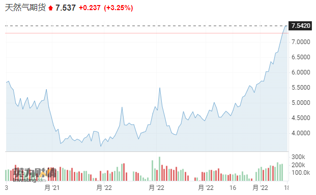4月18日,美國天然氣期貨價格升至7.55美元/百萬英熱,突破1月的高點,較年初價格上漲了約一倍,創逾十三年來的最高水平。
