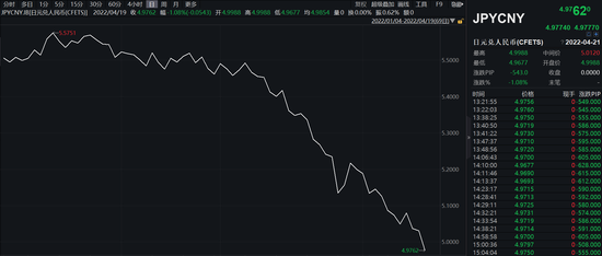 日元兌人民幣匯率也持續下跌,日元兌人民幣週二跌破0.05元關口。如果從年初開始計算,日元匯率相對人民幣貶值幅度超10%。如果跟2019年最高點比,日元兌人民幣已經貶值了27%。