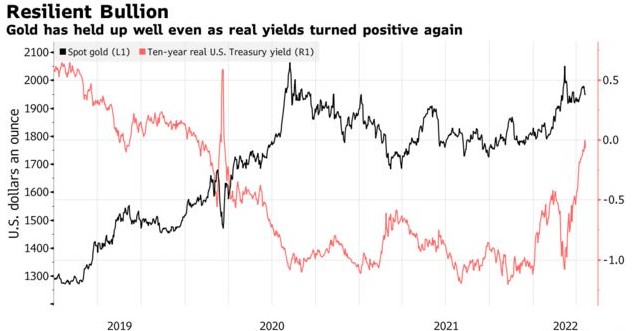 今年金價表現出了極強的韌性,今年迄今以來累計上漲近7%,投資者對美債實際收益率飆升和美元走強不以為然,轉而關注政治和經濟風險,進而推動金價“反常”上漲——因為,正常情況下,金價以美元計價,兩者走勢相反,即美元走強會打壓金價。